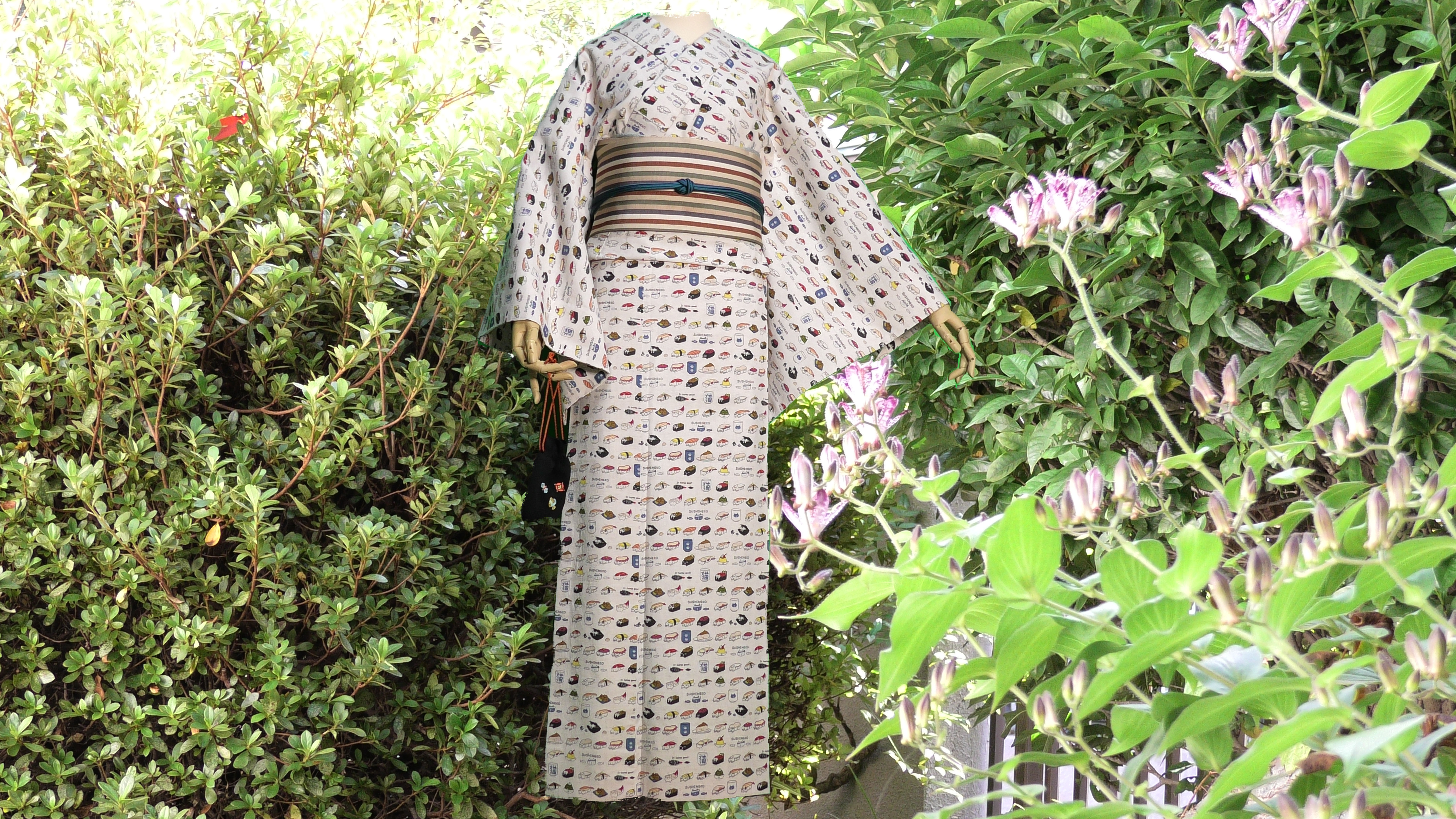 すしねこ柄の綿麻キャンバス地の単衣の着物