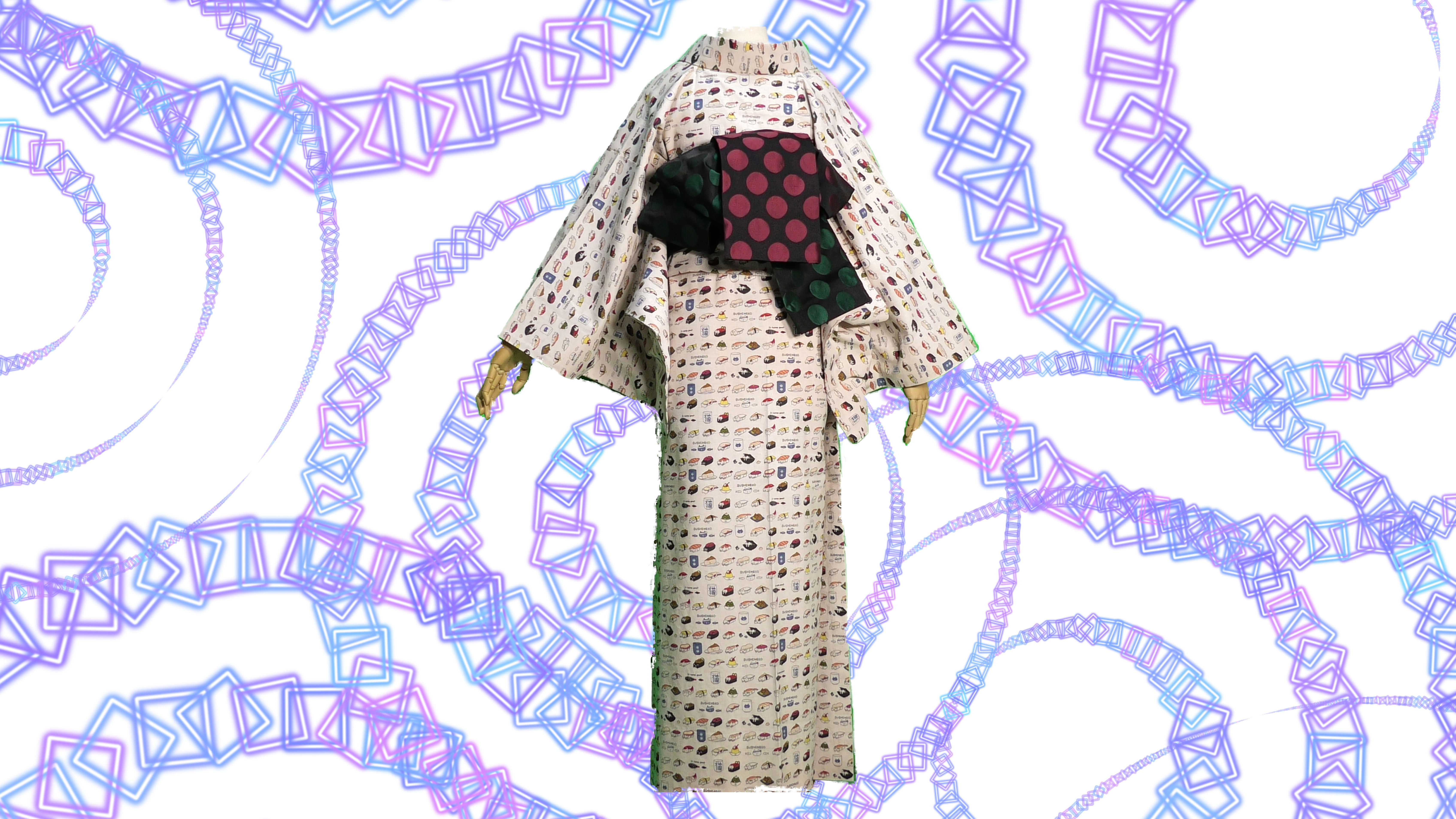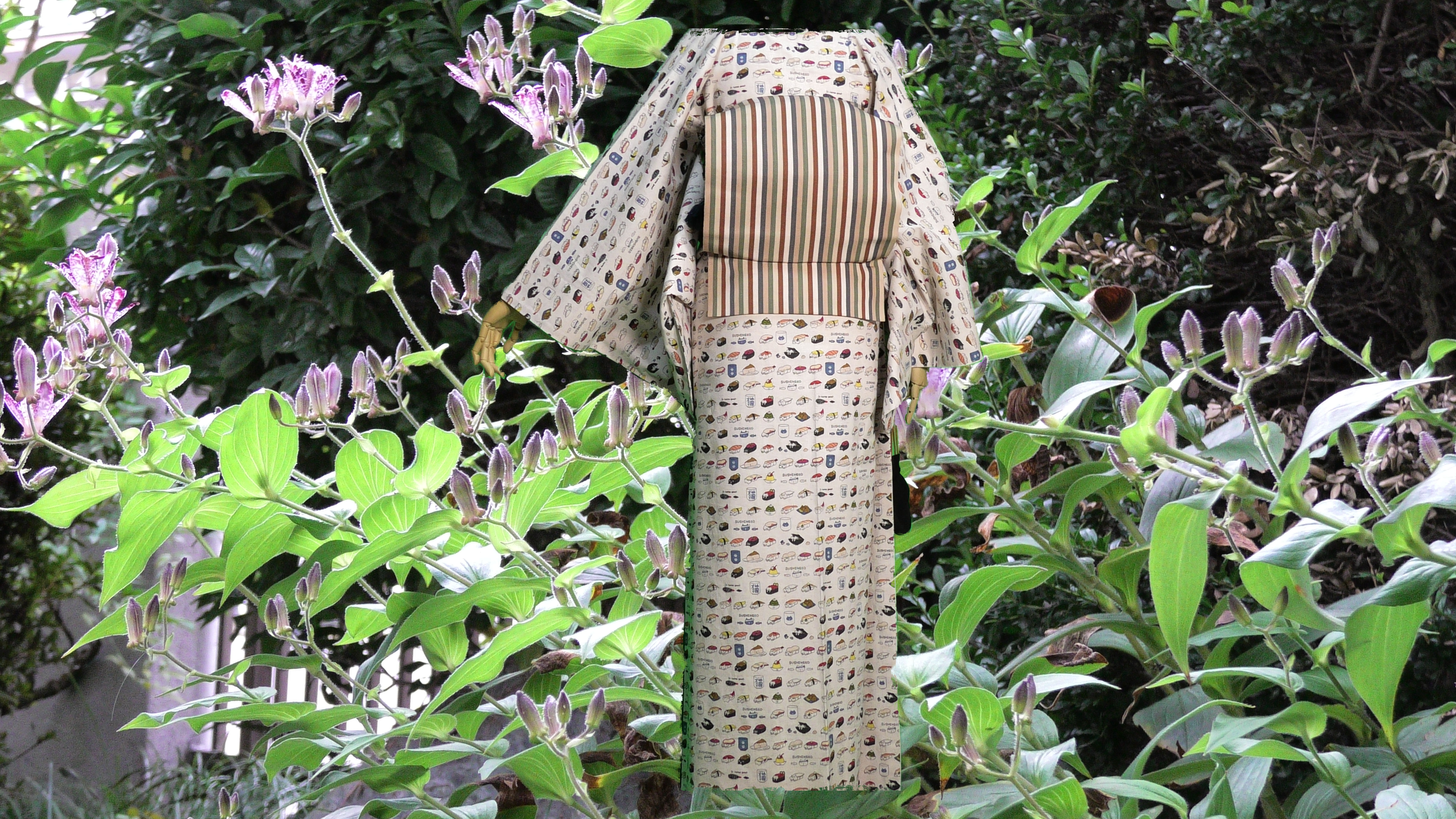 寸法は身丈が肩から4尺3寸2分(163.296cm)、裄が1尺8寸(68.04cm)、後幅7寸8分(29.484cm)、前幅6寸3分(23.814cm)、抱幅5寸9分(22.302cm)です。