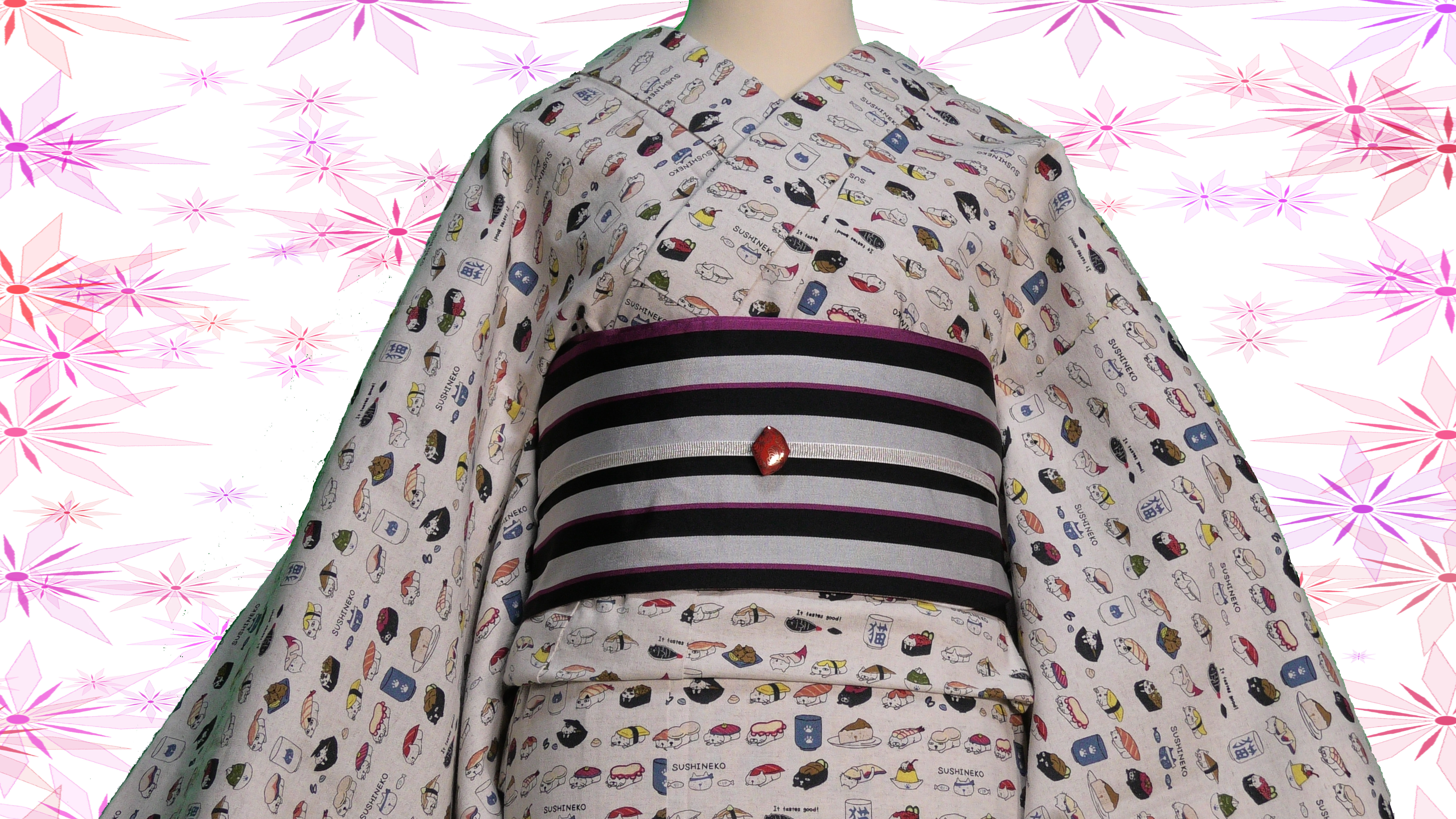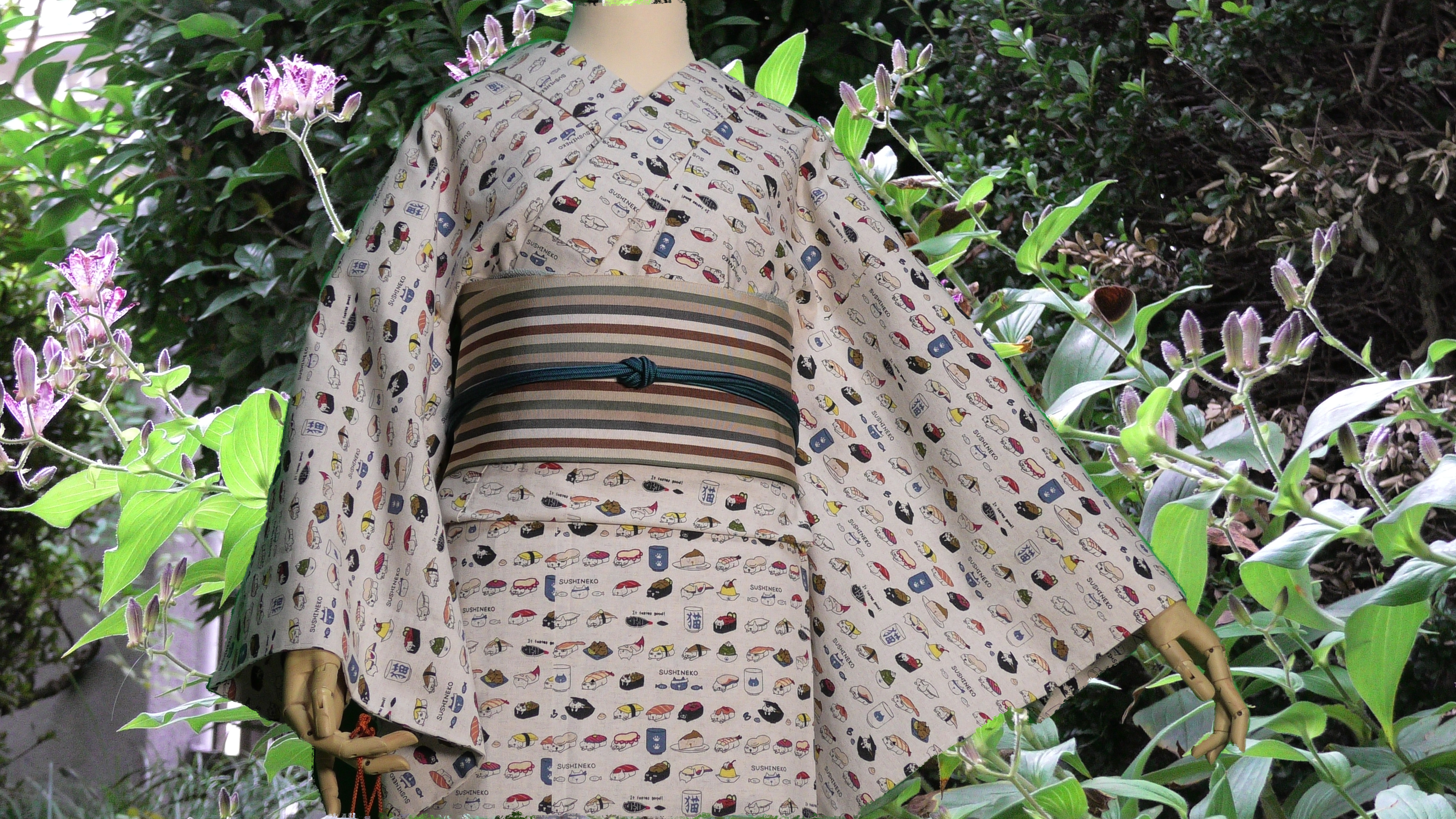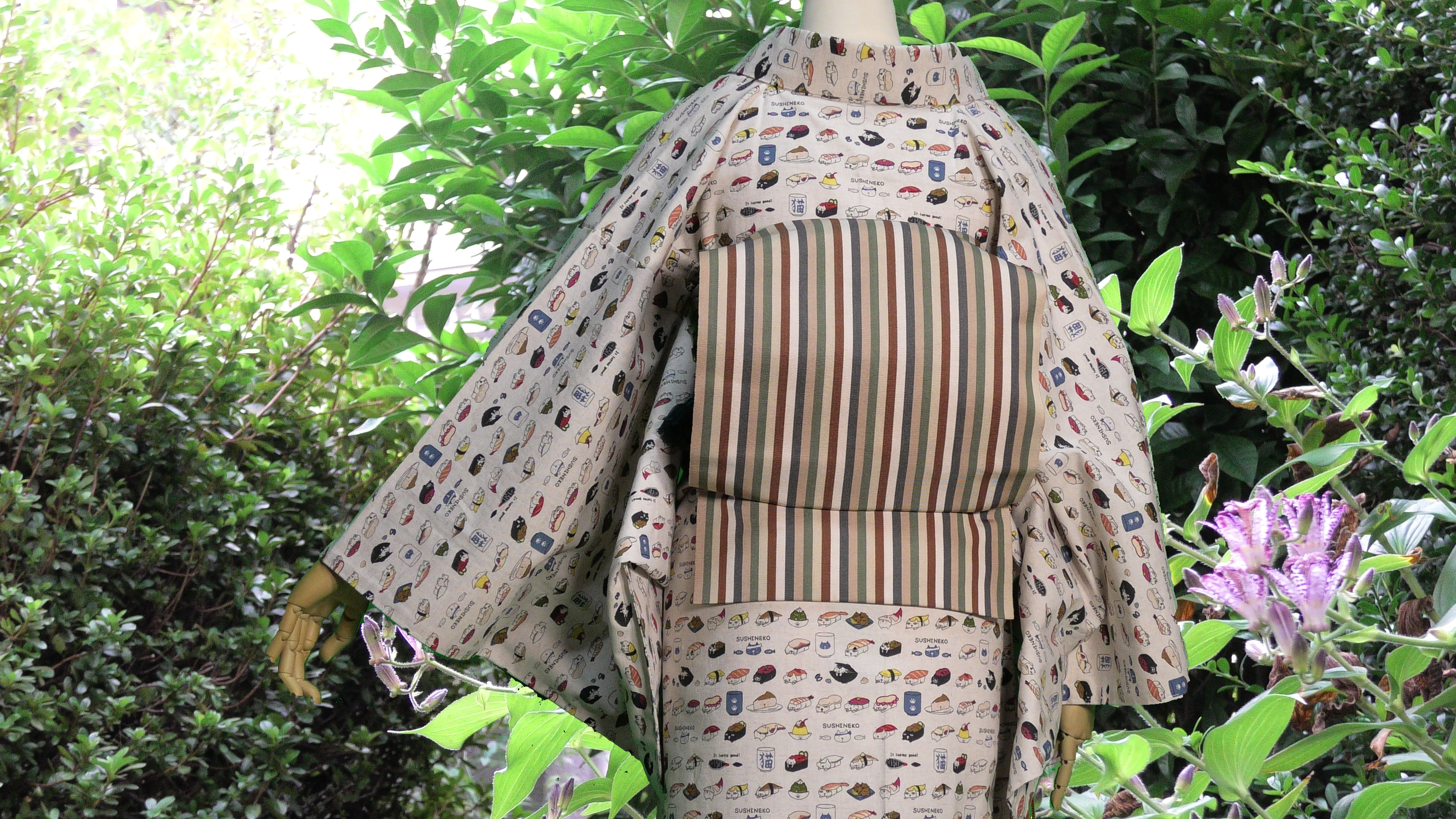 コットン小林さんの生成色のすしねこ柄の綿麻キャンバス地の単衣の着物です。(綿85%、麻15%)