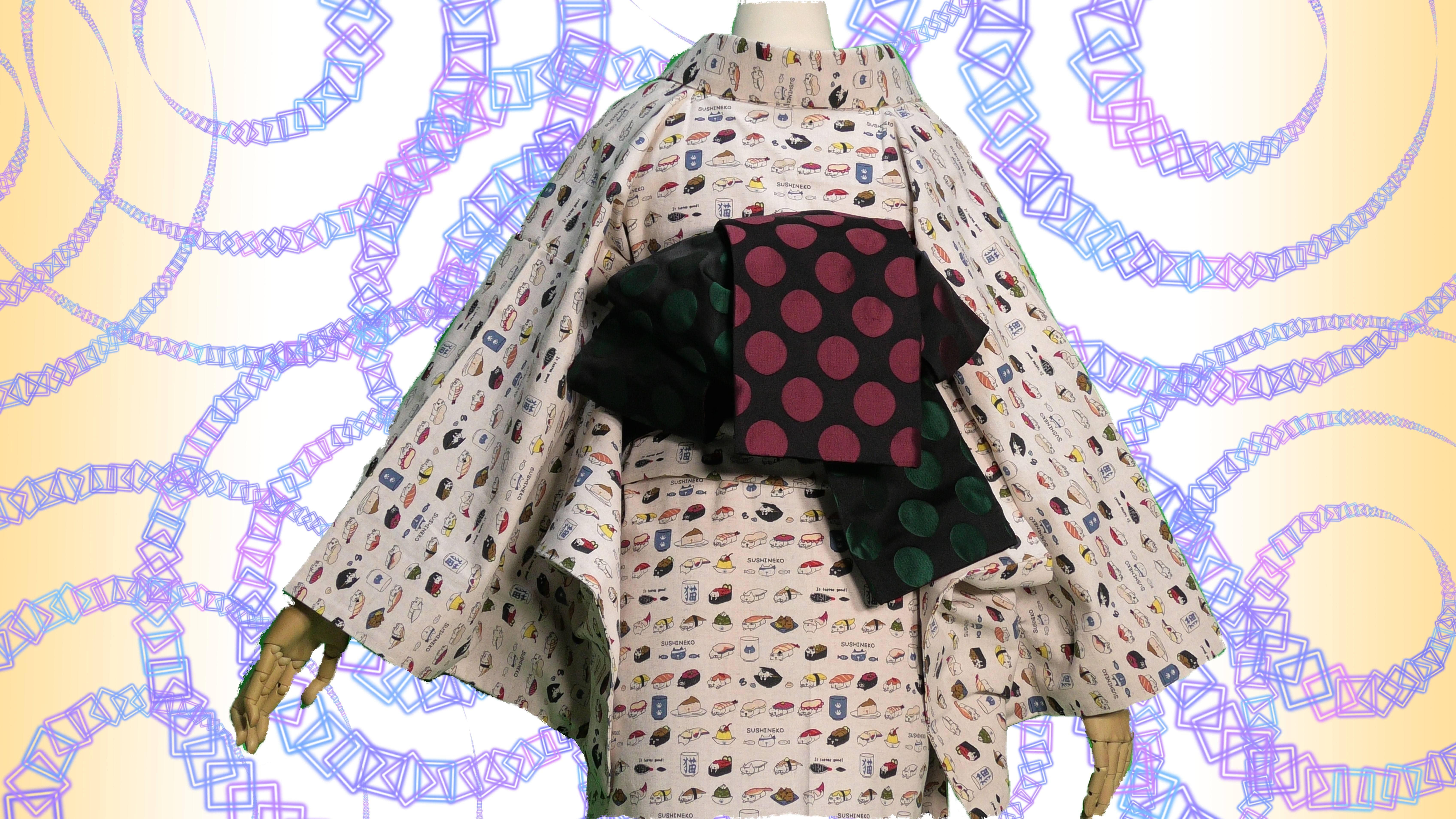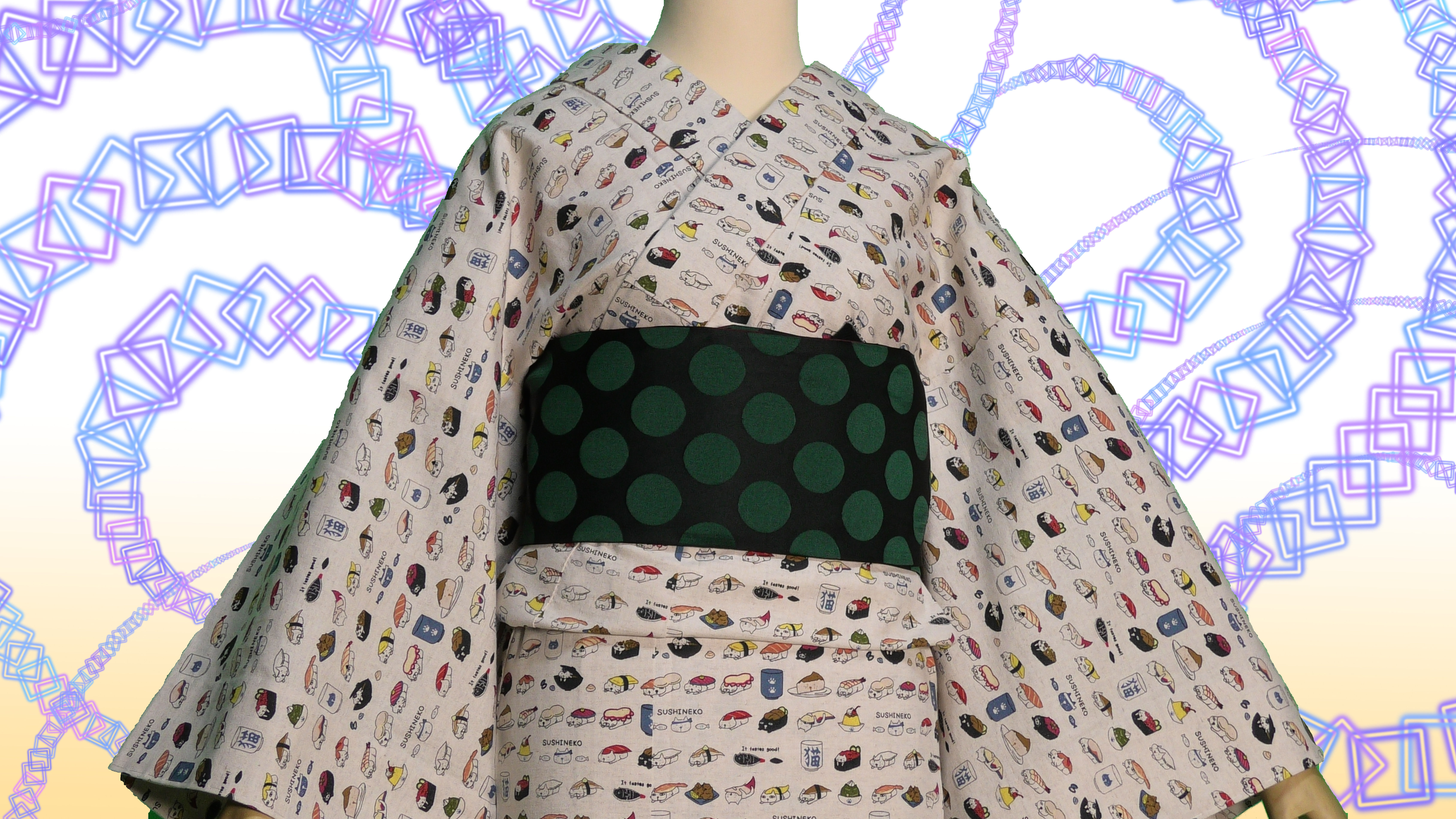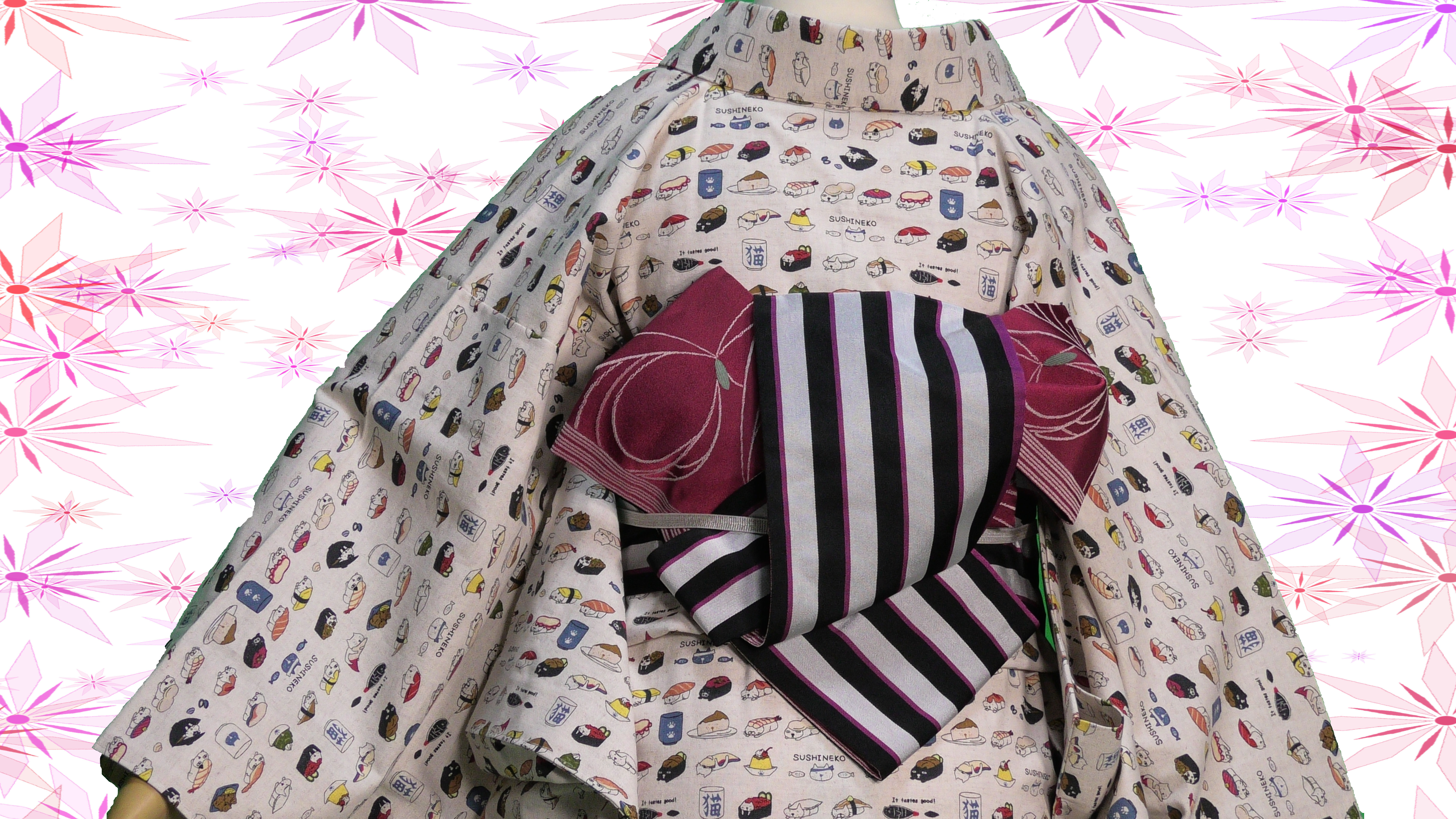 コットン小林さんの生成色のすしねこ柄の綿麻キャンバス地の単衣の着物です。(綿85%、麻15%)