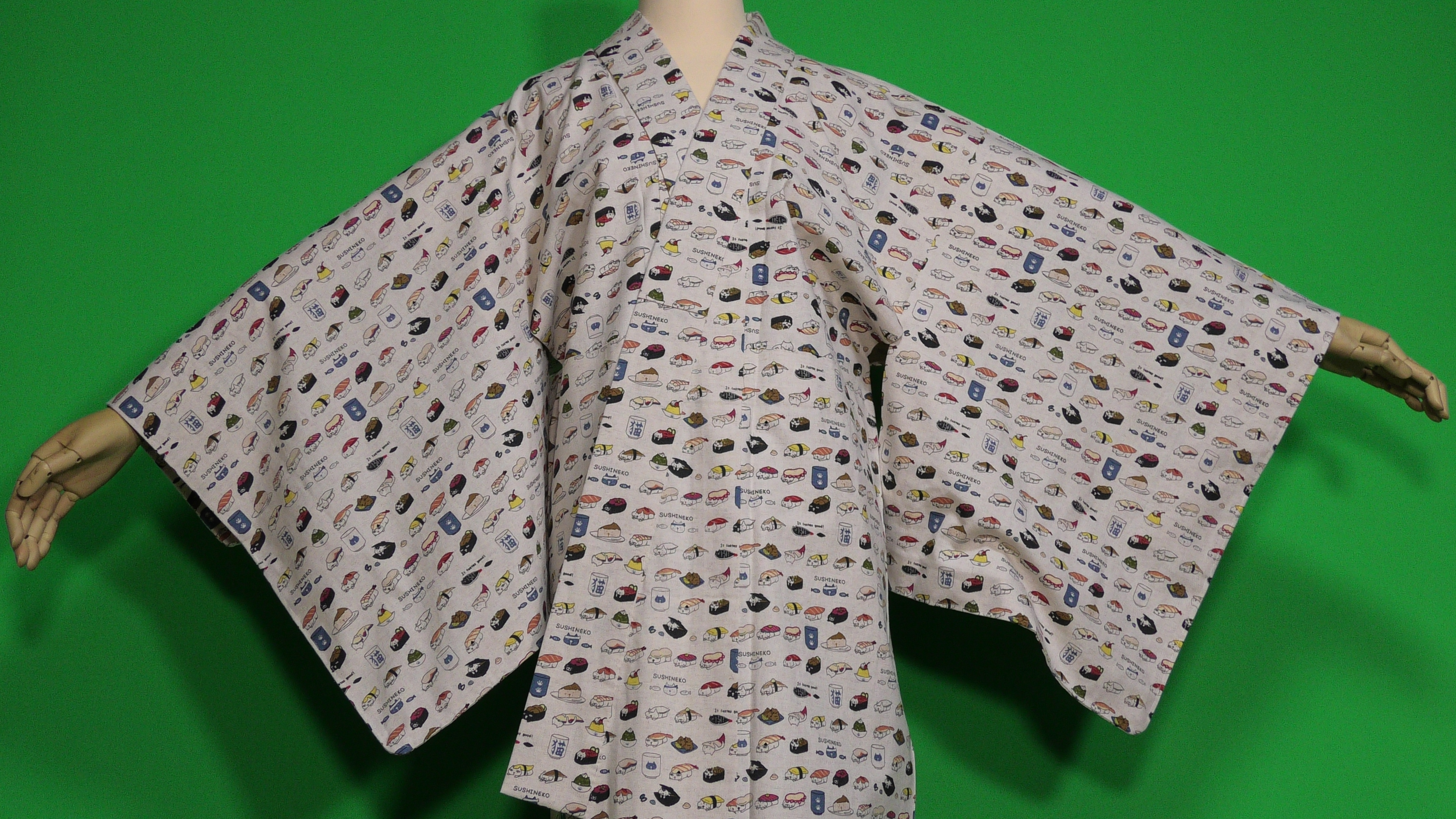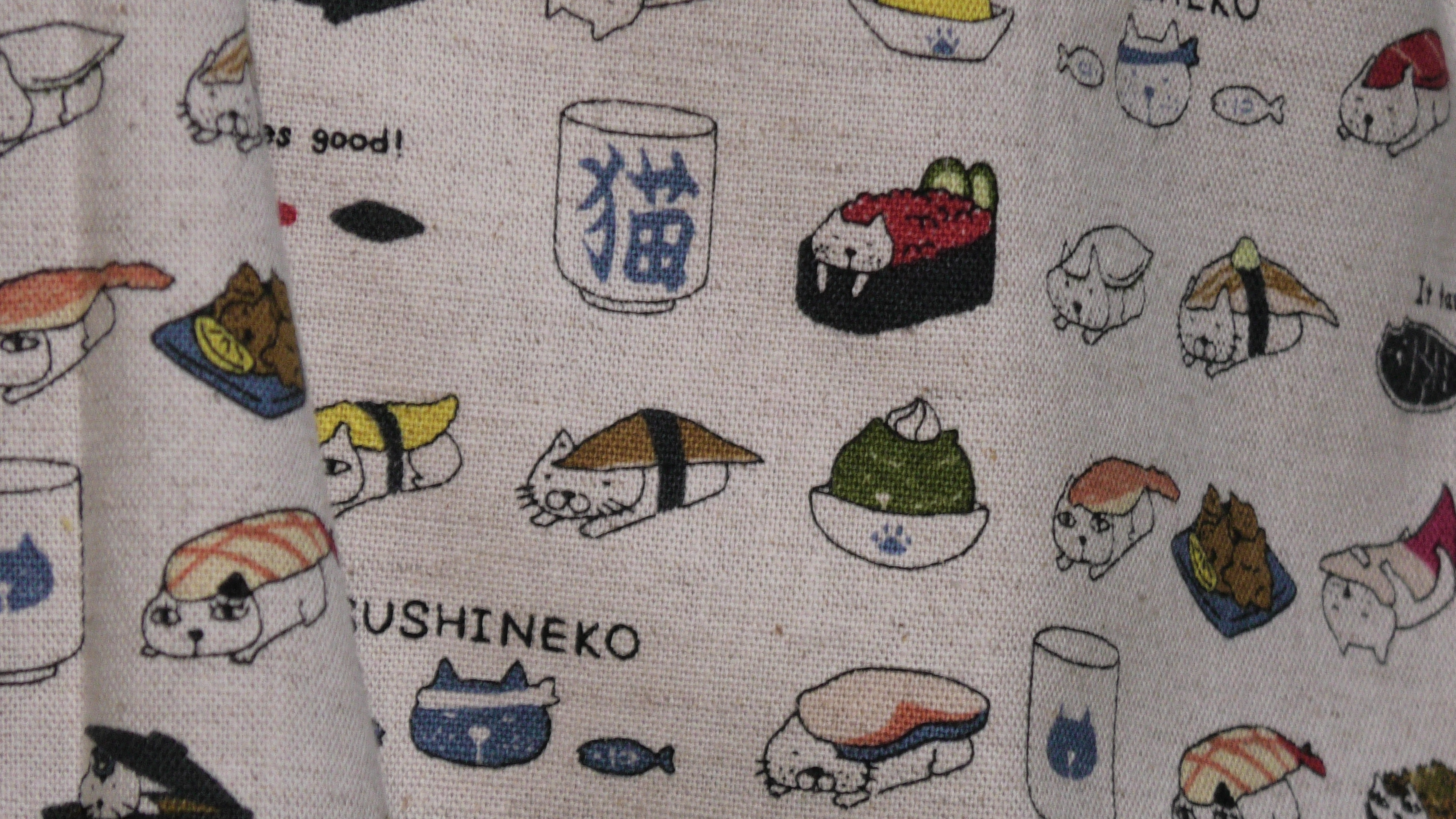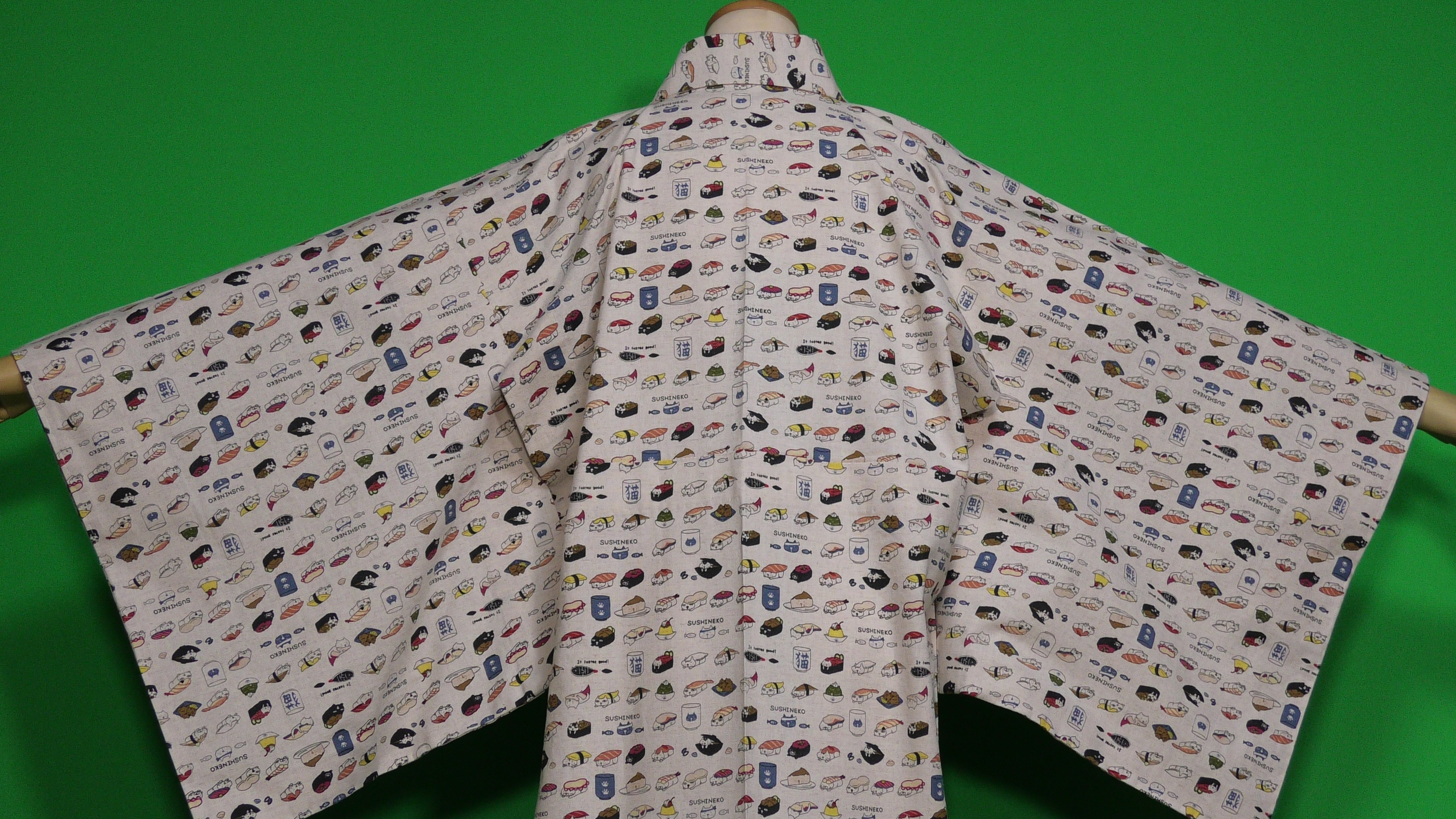 コットン小林さんの生成色のすしねこ柄の綿麻キャンバス地の単衣の着物です。(綿85%、麻15%)