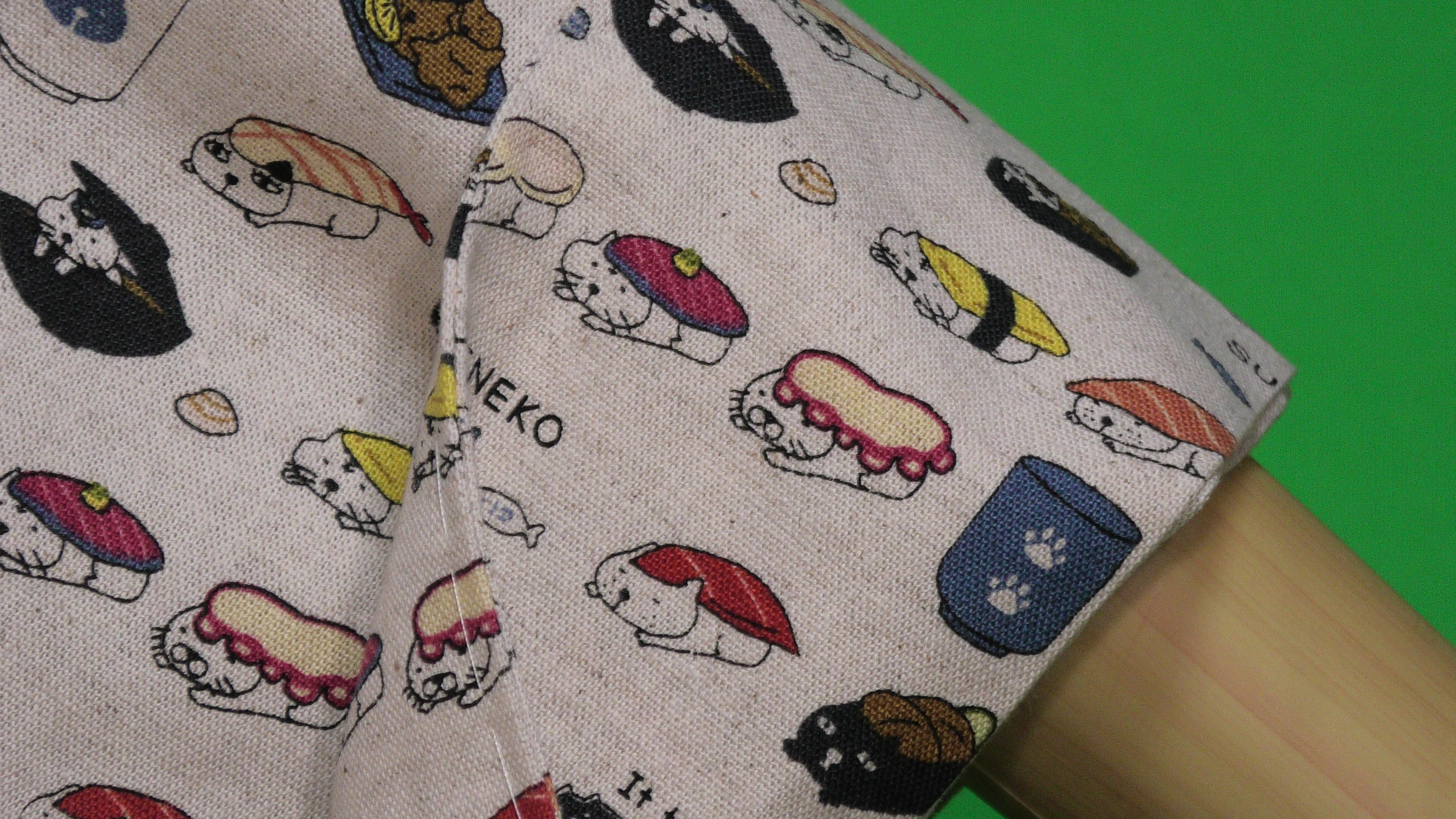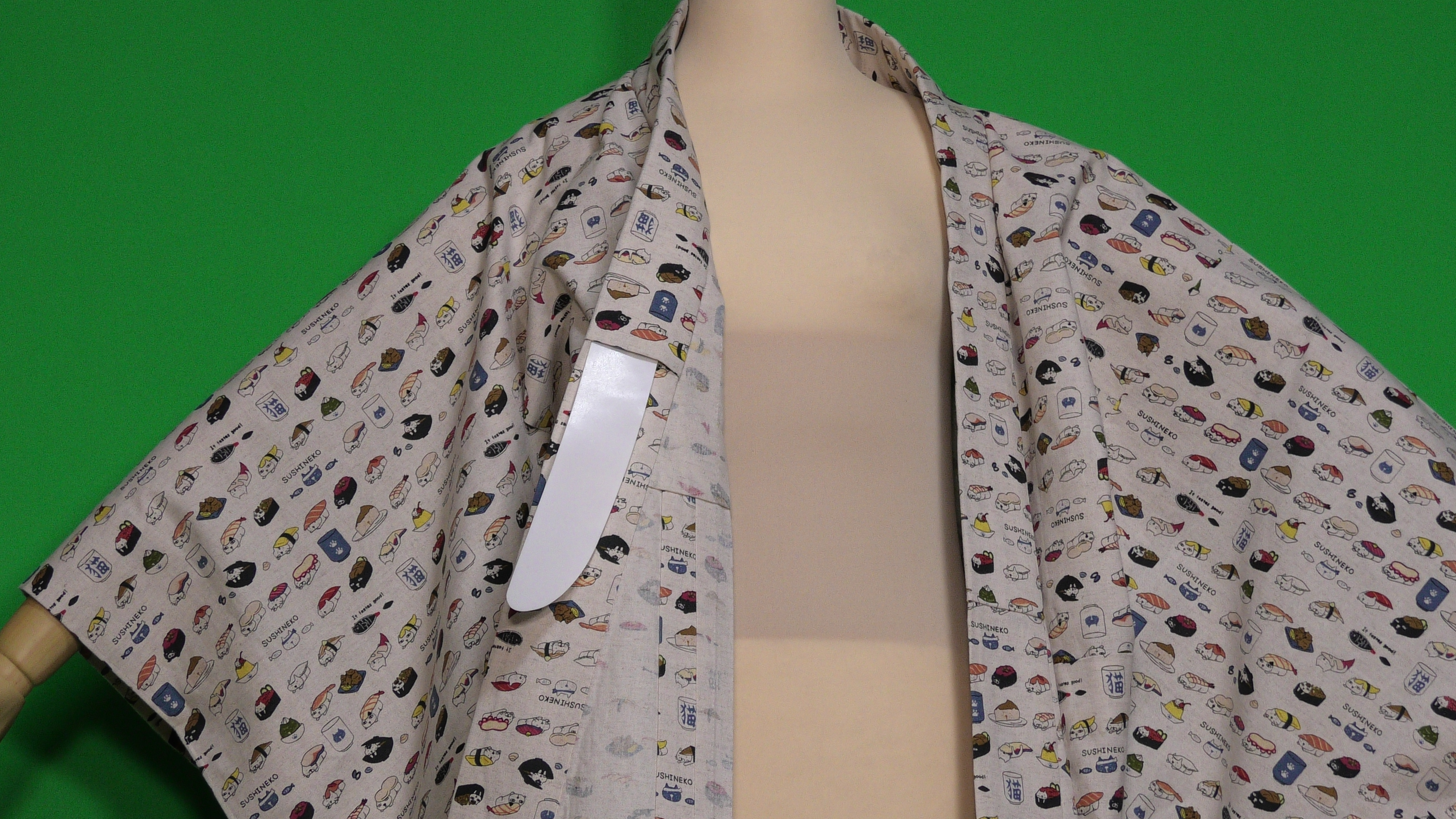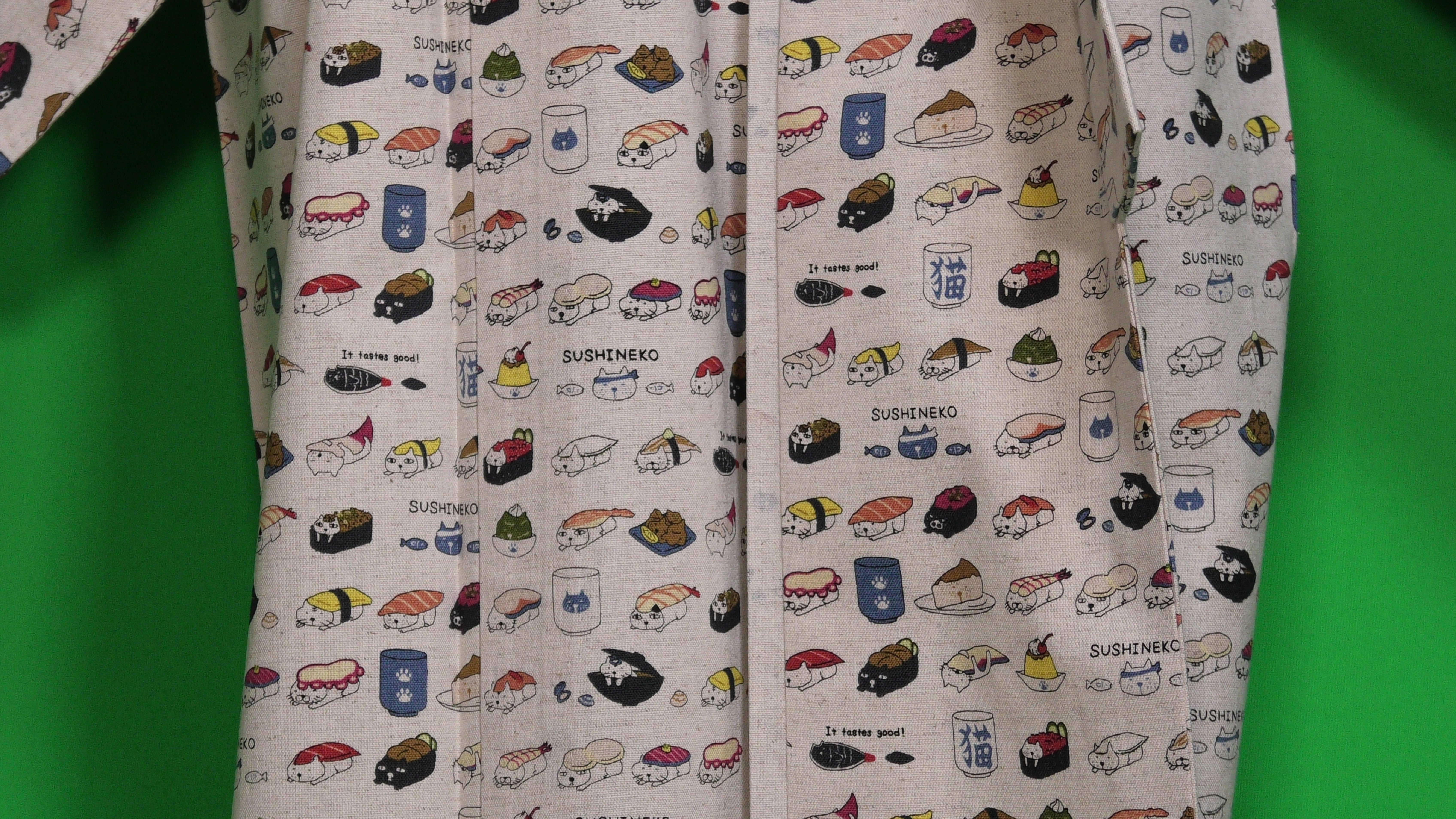 コットン小林さんの生成色のすしねこ柄の綿麻キャンバス地の単衣の着物です。(綿85%、麻15%)