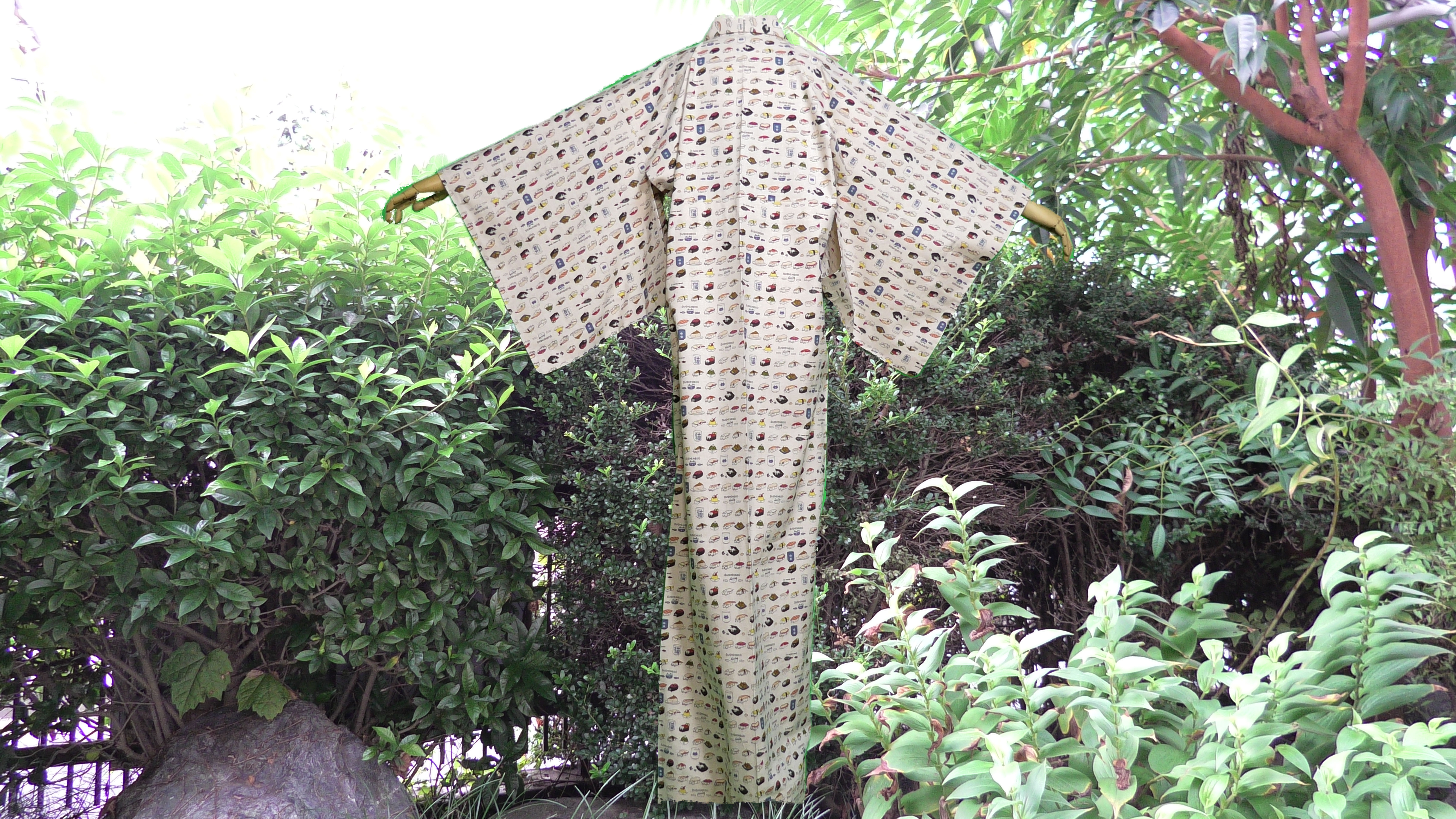 寸法は身丈が肩から4尺3寸2分(163.296cm)、裄が1尺8寸(68.04cm)、後幅7寸8分(29.484cm)、前幅6寸3分(23.814cm)、抱幅5寸9分(22.302cm)です。